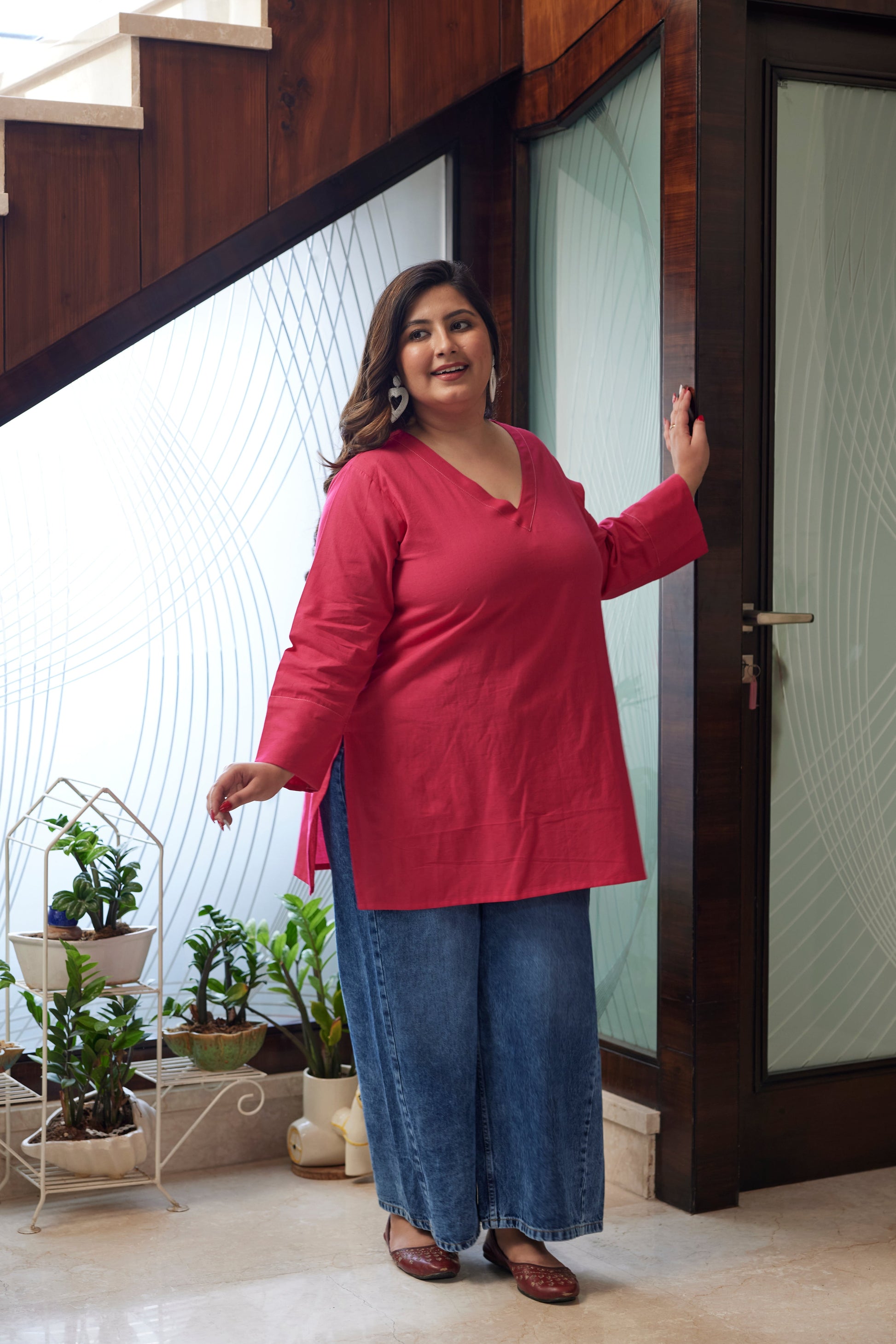 This short kurta-style top in a bright pink flex linen is designed to bring colour and ease to everyday workwear. Featuring a V-neckline with subtle neck detailing and a mid-length cut, it strikes the right balance between polished and comfortable. Lightweight and breathable, it transitions seamlessly from daytime meetings to evening plans.